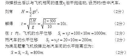 如图所示,飞机离地面高度为H=500m,飞机的水平飞行速度为v1=100m/s,追击一辆速度为v2=20m/s同向行驶的汽车,欲使炸弹击中汽车,飞机应在距离汽车的水平距离多远处投弹?不考虑空气阻力,g取10m/s2。![]()