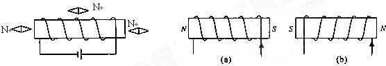 解答:解:由右手螺旋定则可知螺线管中电流由右侧流入,左侧流出,则螺旋管左端为N极,右端为S极;因同名磁极相互排斥,异名磁极相互吸引,故答案如下图: