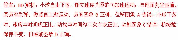 (2013西安摸底)一小球自由下落,与地面发生碰撞,原速率反弹.若从释放小球开始计时,不计小球与地面发生碰撞的时间及空气阻力.则下图中能正确描述小球位移s、速度v、动能Ek、机械能E与时间t关系的是 ( )