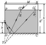 m处有一点光源S,在其正上方放有一长等于水池宽度的标尺AB,S上方有小挡板,使光源发出的光不能直接射到液面,不考虑光在水池面上的反射,求在此横截面上标尺上被照亮的长度和液面上能射出光线部分的长度。