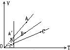 正确解答:因为所给的是V-T图,A,B,C三点的温度体积都不一样,要想比较三个状态的压强,可以利用V-T图上的等压线辅助分析. 在V-T图上,等压线是一条延长线过原点的直线,可以通过A,B,C三点做三条等压线分别表示三个等压过程,如图所示.一定质量的理想气体在等压过程中压强保持不变,体积与温度成正比,为了比较三个等压线所代表的压强的大小,可以做一条等温线(亦可作一条等容线,方法大同小异,以下略),使一个等温过程与三个等压过程联系起来,等温线(温度为