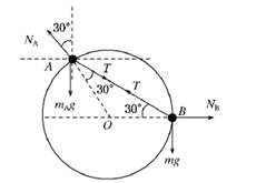 一光滑圆环固定在竖直平面内,环上套着两个小球A和B(小球中央有孔),A与B间由细绳连接着,它们处于如图所示位置时恰好都能保持静止状态,此情况下,B球与环中心O处于同一水平面上,A、B间的细绳呈伸直状态,与水平成30°夹角,已知B球的质量为m,求细绳对B球的拉力和A球的质量.