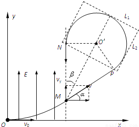 ¡¾´ð°¸¡¿·ÖÎö£º´øµçÁ£×ÓÔڵ糡ÖÐ×öÀàÆ½Å×Ô˶¯£¬Éä³öµç³¡ºó×öÔÈËÙÖ±ÏßÔ˶¯£¬½øÈëÔڴų¡ÖÐ×öÔÈËÙÔ²ÖÜÔ˶¯£¬ÀûÓÃÀàÆ½Å×Ô˶¯µÄ¹æ´Óµç³¡ÖÐÉä³öËÙ¶È·½ÏòµÄ´¹ÏßÒ»£¬´¹×ãΪP£¬ÔòPµãΪÁ£×ÓÉäÈë´Å³¡µÄÈëÉäµã£¬NΪ´Ó´Å³¡ÖÐÉä³öµÄ³õÉäµã£®ÒÔO¡äΪԲÐÄ£¬ONΪ°ë¾¶×öÔ²ÈçÏÂͼ£»¸ÃÔ²¼´ÊÇÁ£×ÓÔ˶¯µÄ¹ì¼££»×öNP µÄƽÐÐÏßÓëÔ²ÏàÇУ¬ÔÙ×öMO¡äµÄÁ½ÌõƽÐÐÏßÓëÔ²ÏàÇУ¬ÔòÕâÈýÌõÇÐÏߺÍMNΧ³ÉµÄÃæ»ý¼´ÊÇ×îÐ¡Ãæ»ý£®
