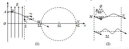 如图(甲)所示,在直角坐标系0≤x≤L区域内有沿y轴正方向的匀强电场,右侧有一个以点(3L,0)为圆心、半径为L的圆形区域,圆形区域与x轴的交点分别为M、N.现有一质量为m,带电量为e的电子,从y轴上的A点以速度v沿x轴正方向射入电场,飞出电场后从M点进入圆形区域,速度方向与x轴夹角为30°.此时在圆形区域加如图(乙)所示周期性变化的磁场,以垂直于纸面向外为磁场正方向),最后电子运动一段时间后从N飞出,速度方向与进入磁场时的速度方向相同(与x轴夹角也为30°).求:(1)电子进入圆形磁场区域时的速度大小;