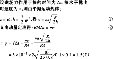 如图,两根平行光滑轨道置于同一水平面上,相互间隔d=0.1 m,质量为3 g的金属棒属于轨道一端,跨在两根轨道上.匀强磁场方向垂直轨道所在平面向上,B=0.1T,轨道平面距地面高度h=0.8 m.当接通电键S时,金属棒受磁场力作用而被水平抛出,落地点水平距离s=2 m.求接通S瞬间,金属棒通过的电量.(g取10 m/s2)