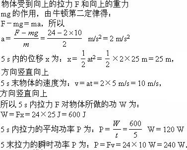 质量为2 kg的物体,受到24 N竖直向上的拉力,由静止开始向上运动,经过5 s的时间,求5 s内拉力对物体所做的功是多少?5 s内拉力的平均功率及5 s末拉力的瞬时功率各是多少?(g取10 m/s2)