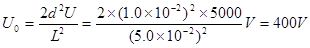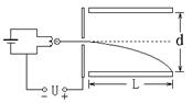 (8分).金属丝经过电源加热后发射出电子(假设初速度为零),电子经U=5000V的加速电压加速后,在距两极板等距离处垂直进入平行板间的匀强电场,如图所示.若两板间距d=1.0cm,板长L=5.0cm,那么,要使电子能从平行板间飞出,两极板间最多能加多大电压?