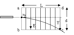 空间中存在着如图所示的竖直方向的匀强电场。已知abcd为一矩形,ab=L=16cm,ad=d=30cm。从某实验装置中喷射出的带正电的微粒,质量m=1.0×10-22kg、带电量q=1.0×10-16C。微粒以垂直于电场方向的速度v0=1.5×104m/s,从ab正中间射入电场,最后从c点射出。不计微粒重力。