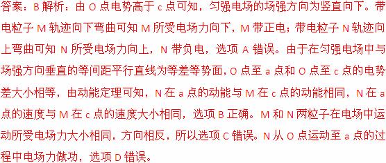 £¨2013°²»Õ½ÄÏʮУÃþµ×£©ÈçͼËùʾ£¬Í¼ÖÐÐéÏßΪÔÈÇ¿µç³¡ÖÐÓ볡ǿ·½Ïò´¹Ö±µÄµÈ¼ä¾àƽÐÐÖ±Ïߣ¬Á½Á£×ÓM¡¢NÖÊÁ¿ÏàµÈ£¬Ëù´øµçÁ¿ÊýÖµÒ²ÏàµÈ£¬ÏÖ½«M¡¢N´ÓÐéÏßÉÏOµãÒÔÏàͬËÙÂÊÉä³ö£¬Á½Á£×ÓÔڵ糡ÖÐÔ˶¯µÄ¹ì¼£·Ö±ðÈçͼÖÐÁ½ÌõʵÏßËùʾ¡£µãa¡¢b¡¢cΪʵÏßÓëÐéÏߵĽ»µã£¬ÒÑÖªOµãµçÊÆ¸ßÓÚcµã¡£Èô²»¼ÆÖØÁ¦£¬Ôò £¨ £©