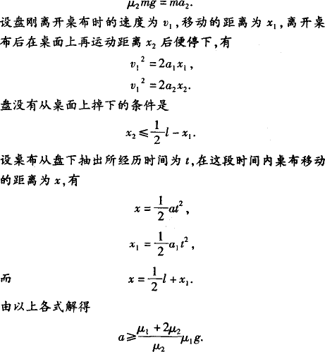 解析:设圆盘的质量为m,桌长为l,在桌布从圆盘下抽出的过程中,盘的加速度为a1,有 μ1 mg=ma1. 桌布抽出后,盘在桌面上做匀减速运动,以a2表示加速度的大小,有