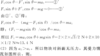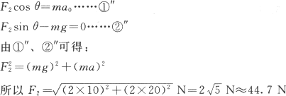 (2)当斜面以a2=20 m/s2向右运动时绳的拉力多大?(F2=?)