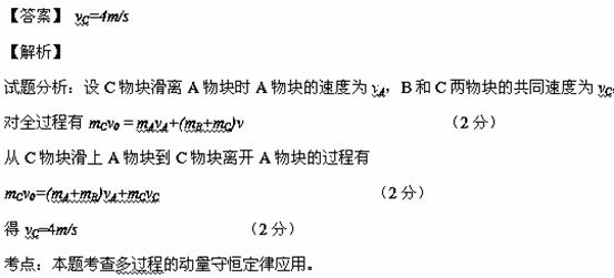 如图所示,在光滑水平面上有两个并排放置的木块A和B,已知mA=500g,mB=300g,一质量为80g的小铜块C以v0=25 m/s的水平初速度开始,在A表面滑动,由于C与A、B间有摩擦,最终铜块C(视为质点)最后停在B上,B和C一起以2.5m/s的速度共同前进,求:C滑上B时的速度