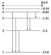 如图所示,氢原子从n>2的某一能级跃迁到n=2的能级,辐射出能量为2.55 eV的光子,问: