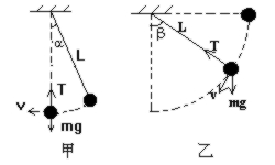 解: 设球的质量为 m、线长为L. (1)令细线需偏离竖直位置的角度为α(图甲), 由摆动中机械能守恒和圆周运动条件