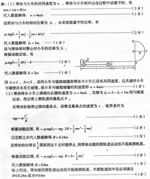 如图所示,地面和半圆轨道面均光滑。质量M=1kg、长L=4m的小车放在地面上,其右端与墙壁距离为S,小车上表面与半圆轨道最低点P的切线相平。现有一质量m=2kg的滑块(不计大小)以v0=6m/s的初速度滑上小车左端,带动小车向右运动。小车与墙壁碰撞时即被粘在墙壁上,已知滑块与小车表面的滑动摩擦因数