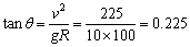 某高速公路转弯处,弯道半径R=100m,汽车轮胎与路面间的动摩擦因数为m=0.23,路面要向圆心处倾斜,汽车若以v=15m/s的设计速度行驶时,在弯道上没有左右滑动趋势,则路面的设计倾角q应为多大?(g=10m/s2)