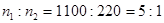 ,由于U1=1100V,U2=220V,所以变压器的匝数比为