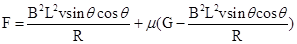 如右图示,一金属框架abcd水平放置在匀强磁场中,导体ab长为L,重为G,可以在框架上滑动,它和框架之间的摩擦系数为μ。已知磁感应强度为B,方向斜向上与框平面成θ角。导体ab的电阻为R,框 架的电阻忽略不计。现要使导体ab沿框架以速度v向右作匀速滑动,求移动ab所需 的水平力。