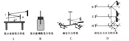 解答:解:而观察桌面形变时,形变微小故运用放大来体现;及显示玻璃瓶受力形变时,通过细管来放大液面是否上升;测万有引力常数时,使转动的位移放大;故这三个实验均用放大思想方法,而探究合力分力的关系时,采用的等效替代法,所以只有D选项中的实验与其它实验采用的方法不同,故ABC错误,D正确.