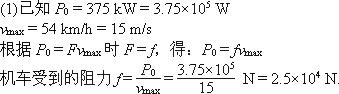 500 t的机车,以恒定功率375 kW由静止出发,经过5 min速度达到最大值54 km/h,设机车所受阻力f恒定不变,取g=10 m/s2,试求:(1)机车受到的阻力f的大小.