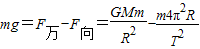 【答案】分析:该题让我们计算物体受到的万有引力,只要将已知的几个物理量代入公式即可,它的重力等于万有引力减去向心力.