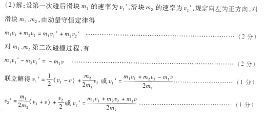 如图所示,质量分别为m1和m2的两个滑块,在光滑水平面上分别以速率v1、v2向左运动,由于v1>v2而发生一维碰撞,碰后m1继续向左运动,m2被左侧的墙以原速率弹回,再次与m1相碰,碰后m2恰好停止,而m1以速率v向右匀速运动。求第一次碰撞后滑块m1、m2的速率。![]()