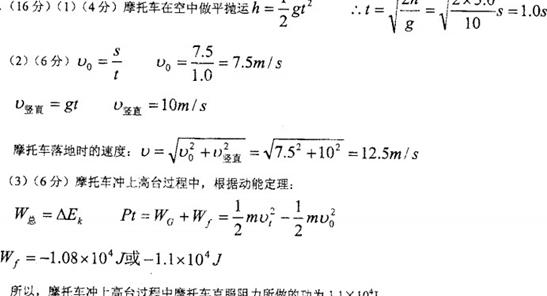 =10m/s的初速度冲向高台,然后从高台水平飞出。若摩托车冲向高台的过程中以P=1.8kW的额定功率行驶,冲到高台上所用时间t=16s,人和车的总质量m=1.8×102kg,台高h=5.0m,摩托车的落地点到高台的水平距离s=7.5m。不计空气阻力,取g=10m/s2。求:![]()