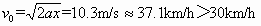 在某城市的一条道路上,规定车辆行驶速度不得超过30km/h。在一次交通事故中,肇事车是一辆卡车,量得这辆卡车紧急刹车(车轮被抱死)时留下的刹车痕迹长为7.6m。经过测试得知这种轮胎与路面的动摩擦因数为0.7,请判断该车是否超速。