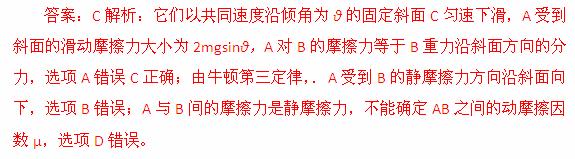 (2013安徽师大摸底)如图所示,物体B叠放在物体A上,A、B的质量均为m,且上、下表面均与斜面平行,它们以共同速度沿倾角为θ的固定斜面C匀速下滑,则( )