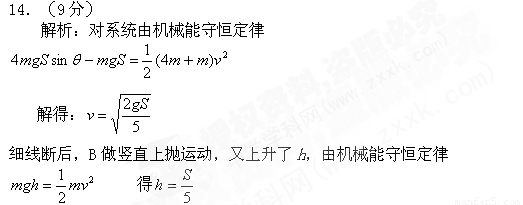 如图所示,一固定的楔形木块,其斜面的倾角θ=30°,另一边与地面垂直,顶上有一定滑轮.一柔软的细线跨过定滑轮,两端分别与物块A和B连结,A的质量为4m,B的质量为m,开始时将B按在地面上不动,然后放开手,让A沿斜面下滑而B上升.物块A与斜面间无摩擦.设当A沿斜面下滑S 距离后,细线突然断了.求物块B上升离地的最大高度H.