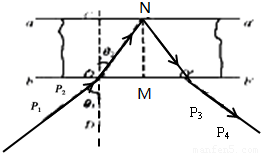解答:解:(1)确定P3、P4位置的作图方法:由于aa′表面镀银,只能反射,所以光路为:入射光线、经过bb′的折射光线、经过aa′的反射光线、再次经过bb′的折射后的出射光线(P3、P4的连线),作出此光路,即可标出P3、P4的位置.