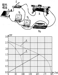 (3)实验一中的路端电压为U1=1.5V时电路中电流为I1=0.21mA,连接a中点(0.21mA、1.5V)和坐标原点,此直线为此时对应滑动变阻器阻值的外电路电阻(定值电阻)的U-I图,和图线b的交点为实验二中的路端电压和电路电流,如右图,电流和电压分别为I=97μA、U=0.7V,则外电路消耗功率为P=UI=0.065 mW.