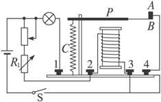 解析:电路设计如图所示,原理简述:据光敏电阻的阻值随入射光强度的增强而减小,当白天时,照射光敏电阻的光强度大,R1阻值减小,电流增大,电磁铁把衔铁P吸下使B脱离A,切断电灯电路,夜晚时相反.