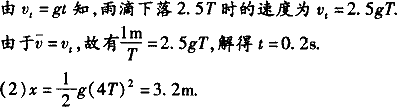 解析:由图所示,如果将这5滴水的运动等效为一滴水的自由落体,并且将这一滴水运动的全过程分成时间相等的4段,设时间间隔为T,则这一滴水在0时刻,Ts末、2Ts末、3Ts末、4Ts末所处的位置,分别对应图示第5滴水、第4滴水、第3滴水、第2滴水、第1滴水所处的位置,据此可作出解答. 解法Ⅰ:利用基本规律求解. (1)设屋檐离地面高为x,滴水间隔为T.