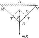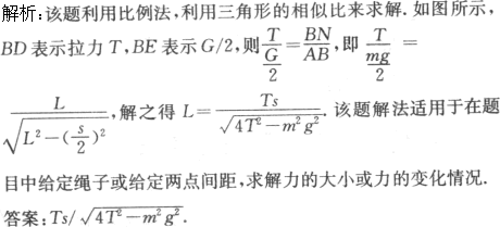两根长度相等的轻绳,下端悬挂一质量为m的物体,上端分别固定在水平天花板上的M、N点,M、N两点间的距离为s,如图所示,已知两绳所能经受的最大拉力均为T,则每根绳的长度不得短于_______.