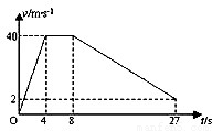 (2)跳伞运动员先做自由落体运动,加速度为g=10m/s2,4s末的速度为v=gt=40m/s.张开降落伞匀速下降的速度为40m/s,运动时间为4s.最后做19s匀减速下降,初速度为40m/s,末速度为2m/s.v-t图象如图所示.