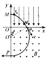 在平面直角坐标系xOy中,第Ⅰ象限存在沿y轴负方向的匀强电场,第Ⅳ象限存在垂直于坐标平面向外的匀强磁场,磁感应强度为B.一质量为m、电荷量为q的带正电的粒子从y轴正半轴上的M点以速度v0垂直于y轴射入电场,经x轴上的N点与x轴正方向成θ=60°角射入磁场,最后从y轴负半轴上的P点垂直于y轴射出磁场,如图所示。不计粒子重力,求