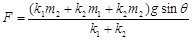 如图所示,在倾角为θ的光滑斜面上,劲度系数分别为k1、k2到两个轻弹簧沿斜面挂着,两弹簧之间有一质量为m1的重物,最下端挂一质量为m2的重物,现用力F沿斜面向上缓慢推动m2,当两弹簧的总长等于两弹簧原长之和时,试求: