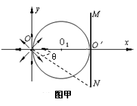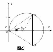 (3)为使MN的右侧都有粒子打到,打在N点的粒子最小半径的轨迹为图乙中的圆弧OMN。 (2分)