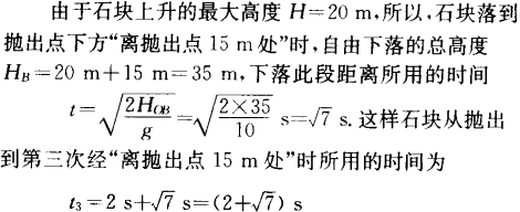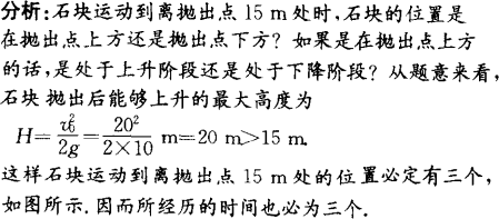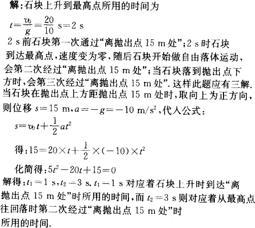 某人在高层楼房的阳台外侧以20 m/s的速度竖直抛出一个石块,石块运动到离抛出点15 m处时,所经历的时间为多少?(不计空气阻力,g取10 m/s2)
