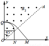 (2)粒子进入磁场后做圆周运动,离子通过x轴时的速度方向与x轴正方向夹角在45°~90°之间,分别根据几何关系求出45°和90°两个临界状态的半径,进而求出OM和ON的长度,即可求得离子到达x轴的区间范围;