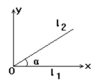 解: L1为初速度为0, 加速度为a的运动轨迹, L2为速度为v0的运动轨迹,L1和L2相交于O, 它们的夹角为α. 建立直角坐标系xOy, 则此两个运动的合运动在x方向和y方向的分运动的方程分别为
