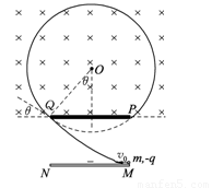 ,PQ板带正电,MN板带负电,在PQ板的上方有垂直纸面向里的匀强磁场.一个电荷量为q、质量为m的带负电粒子以速度v。从MN板边缘沿平行于板的方向射入两板间,结果粒子恰好从PQ板左边缘飞进磁场,然后又恰好从PQ板的右边缘飞进电场.不计粒子重力.求: