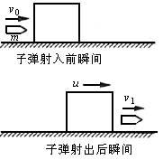 | 解:子弹和木块组成的系统所受合外力为零,系统总动量守恒,如图,由动量守恒定律得:mv0=mv1+Mu,代入数据解得u=0.2m/s
