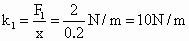 压缩距离在 0~0.2m时,压力等于一根弹簧中的弹力.当压缩距离大于0.2m时,压力等于两根弹簧的弹力之和.由 (b)图知,当x=0.2m时,当大弹簧压缩 0.3m时,小弹簧压缩0.1m,此时压力由此得: 解得 |