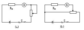 2.选择电路:若用图(a)所示的限流接法.电路中最小电流Imin=E1/(Rx+R)=577μA.而实验提供的电流表的量程都不能满足要求,不能用限流接法.故供电电路只能选择如图(b)所示的分压接法. 3.选择电表:由上述确定的电源和供电电路可知,供电的最大电流值Imax=E1/Rx=600μA,显见,题目所提供的电流表A1和A2均达不到要求,但由于A2更接近,所以电流表选A2电路的安全和实验的精度能得到较高的保证.这样,Rx上的最大电压值Uxmax= 4.选择伏安电路:由于RV/Rx=100kΩ/25kΩ=4,Rx/RA=25kΩ/300Ω=83.3,即Rx/RA>RV/Rx.电流表的分压作用较小,故采用内接方式时误差较小. |