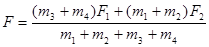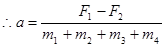质量分别为m1、m2、m3、m4的四个物体彼此用轻绳连接,放在光滑的桌面上,拉力F1、F2分别水平地加在m1、m4上,如图-8所示。求物体系的加速度a和连接m2、m3轻绳的张力F。(F1>F2)![]()