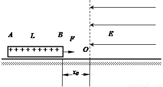 如图所示,在光滑绝缘水平面上,质量为m的均匀绝缘棒AB长为L、带有正电,电量为Q且均匀分布。在水平面上O点右侧有匀强电场,场强大小为E,其方向为水平向左,BO距离为x0,若棒在水平向右的大小为QE/4的恒力作用下由静止开始运动。求:
