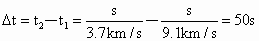 地震波的纵波和横波在地表附近的传播速度分别为9.1km/s和3.7km/s,在一次地震时某观测站记录的纵波和横波的到达时刻相差50s,地震的震源距这个观测站的距离约为多少千米?