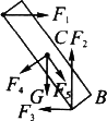 解析:严格按受力分析的步骤进行分析,养成一种好习惯. (1)明确研究对象是木板AB,把AB木板从图中隔离出来,单独画在图上. (2)画出物体AB的重力示意图G. (3)环绕AB一周,找出其他物体与AB的接触处:木板与墙在A处相接触、与地面在B处相接触、与物体m在C处相接触一共有三处与外界接触 (4)在A处,由于墙面是光滑的,那么木板AB在A处只受向右的(支持力)弹力F1作用,在B处,受地面竖直向上的弹力F2(支持力);假设地面光滑,木板AB可向右滑动,所以地面给木板B端一个向左的摩擦力F3作用;在C处,m对木板有一个垂直木板向下的(压力)弹力F4,又因为m静止在木板AB上,m要受到木板AB向上的静摩擦力作用,所以木板受到m施加向下的静摩擦力F5的作用. |